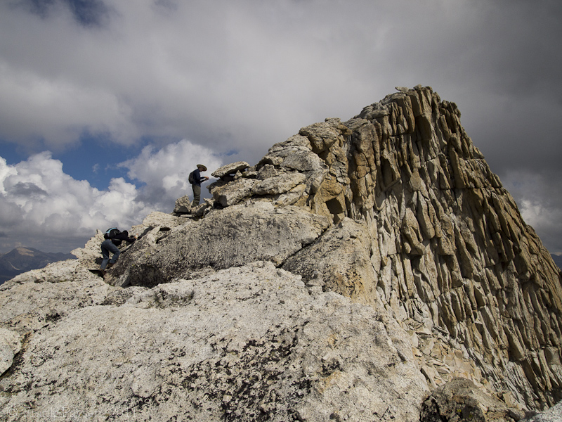 Stella, focused on a big rock, does not see the sheer drop on the right side of the ridge. For Bill, things get narrower. Is that radio tuned?
