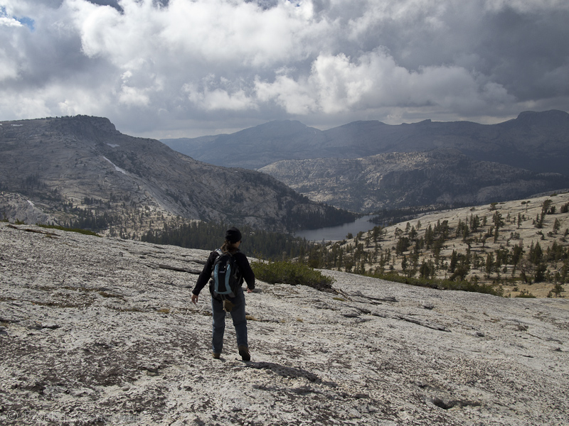 Stella looks down at Upper Cathedral Lake - where we will rejoin the John Muir Trail.