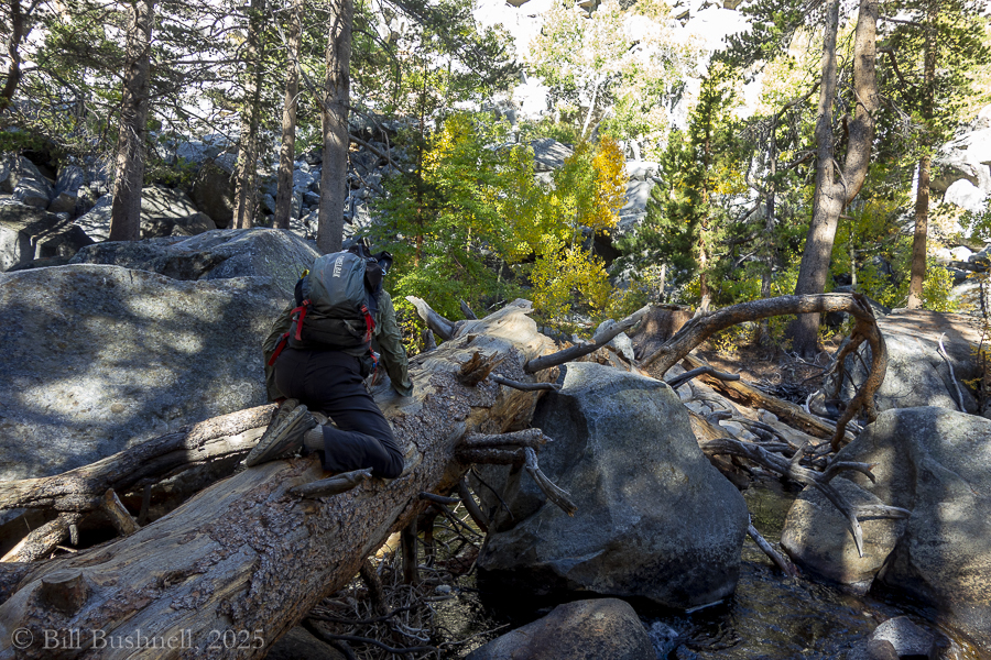 First hurdle is crossing Rock Creek with two back-packs each. We each made two trips across the fallen tree bridge, one pack at a time. -F.
