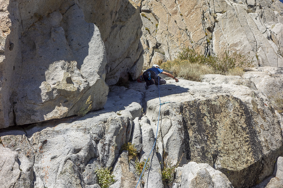 Very low angle slab to the anchor bolts, which turned out to be a mess. The left one spins, the right one has so little clearance that you can only get a single carabiner in it, and that one gets torqued between the bolt and the rock. I chained two quick-links onto the left one for later, and then had Stella lower me. -F.