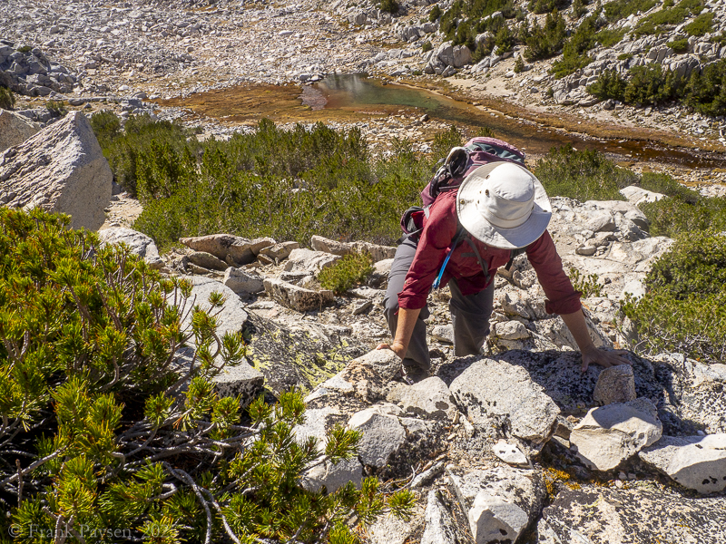 Stella climbs the last bit up the outcropping where we'll eat lunch. We've run out the clock on our attempt. We had stopped here on our last, successful, attempt as well, dejected, thinking we're not going to make it because there's such a long way to go and it's getting late and we're tired. -F.