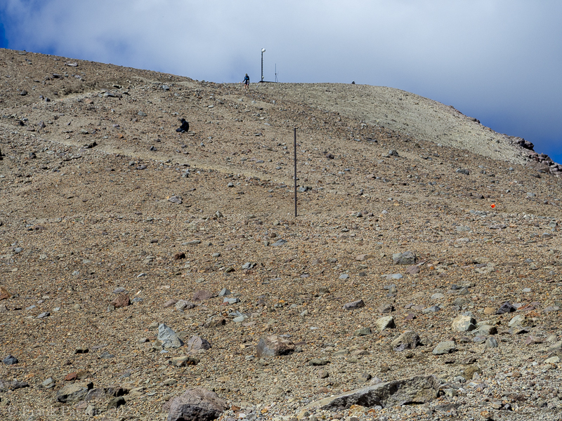 The summit is in view now. A photographer sits bundled up in warm clothing on the slope beside the trail. It's getting really cold and the strong wind bites. -F.