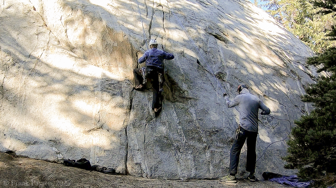 The low angle bottom of the wall was slippery and smearing didn't feel secure. I was glad I was on top-rope! It wasn't hard to hold on, there were plenty of hand holds, but to keep the feet from slipping one needs to get one's weight over them, sticking the butt out, and then the shoulders, too are further from the wall. This was a very unaccustomed posture for me on the wall, and while the climb was technically not difficult, it was surprisingly physical. -F,