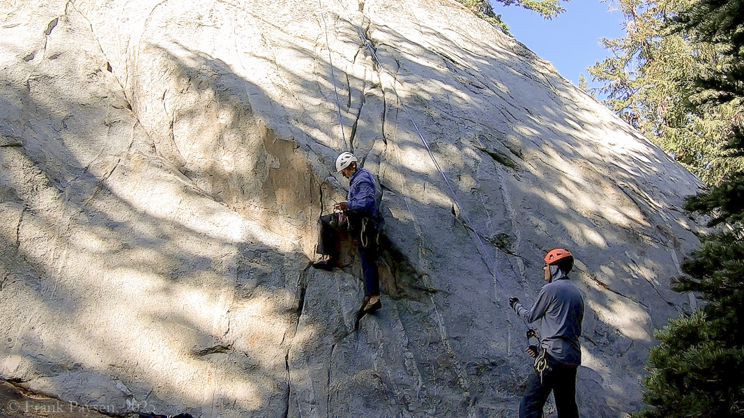 The bigger problem was, that I wasn't finding placements for the cams! The cracks were shallow and flared outward. Not only could you not hand-jam, you couldn't stick gear into them! Now I was really glad I was on top-rope! After a couple of stops and searches for placements, I gave up on the trad lead idea and just climbed to the top. It felt harder than it should, physically speaking. -F.